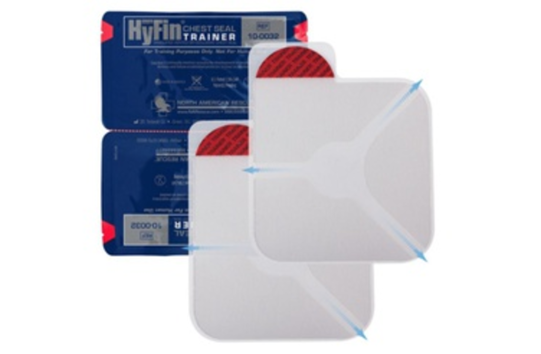 Identifying the need for an effective training chest seal, North American Rescue has developed the HyFin® Chest Seal Trainer. Understanding the need and importance of the form, fit, and function of training devices, the HyFin® Chest Seal Trainer provides a cost effective solution to equip providers with the best training alternative, other than using the actual device, for both vented and occlusive chest seals. Specifically designed to increase user familiarity, the HyFin® Chest Seal Trainer utilizes the same template as the HyFin® Vent Chest Seal Twin Pack, but uses a less aggressive adhesive designed for effective chest seal application on both human skin and a training manikin. This allows for training of proper placement of not only the chest seal itself, but also of the vent over a simulated wound.